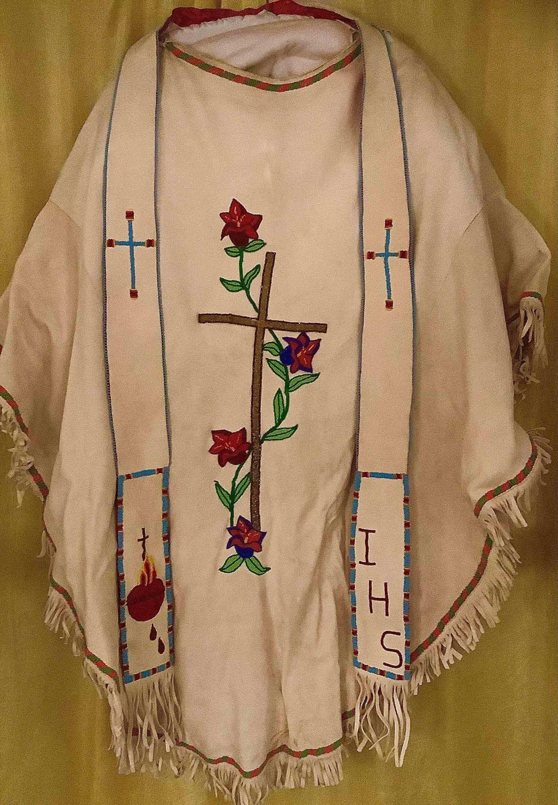 Now on display in the Feehan Memorial Library, this one-of-a-kind American beaded buckskin chasuble carries a story of faith, service, and gratitude. It was originally presented to Archbishop Thomas J. Murphy by parishioners in appreciation of his ministry.