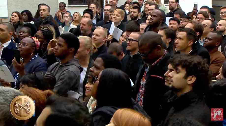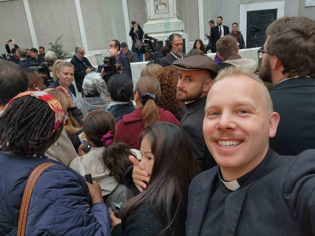 When the Pope finally made his way through the courtyard, everyone tried to see him and shake his hand, yet shortly after his warm greeting, the Liturgy of the Word Service started and we all watched in on a giant TV from the courtyard.