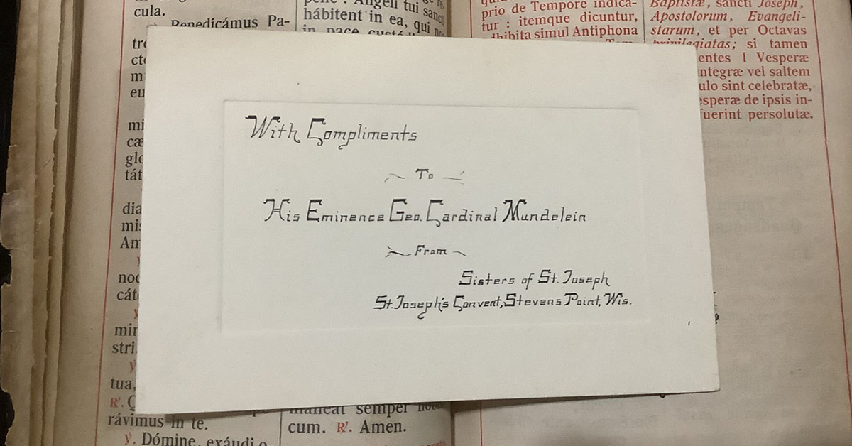 Museums display items not only of beauty, but also items of history and use. This breviary was owned and used by Cardinal Mundelein. A gift from the Sisters of St. Joseph in Wisconsin, its tattered cover and well-thumbed pages are a beautiful testimony to a life devoted to God. You can see this breviary, along with other items used daily by the Cardinal, on the Cardinal’s desk in the museum.