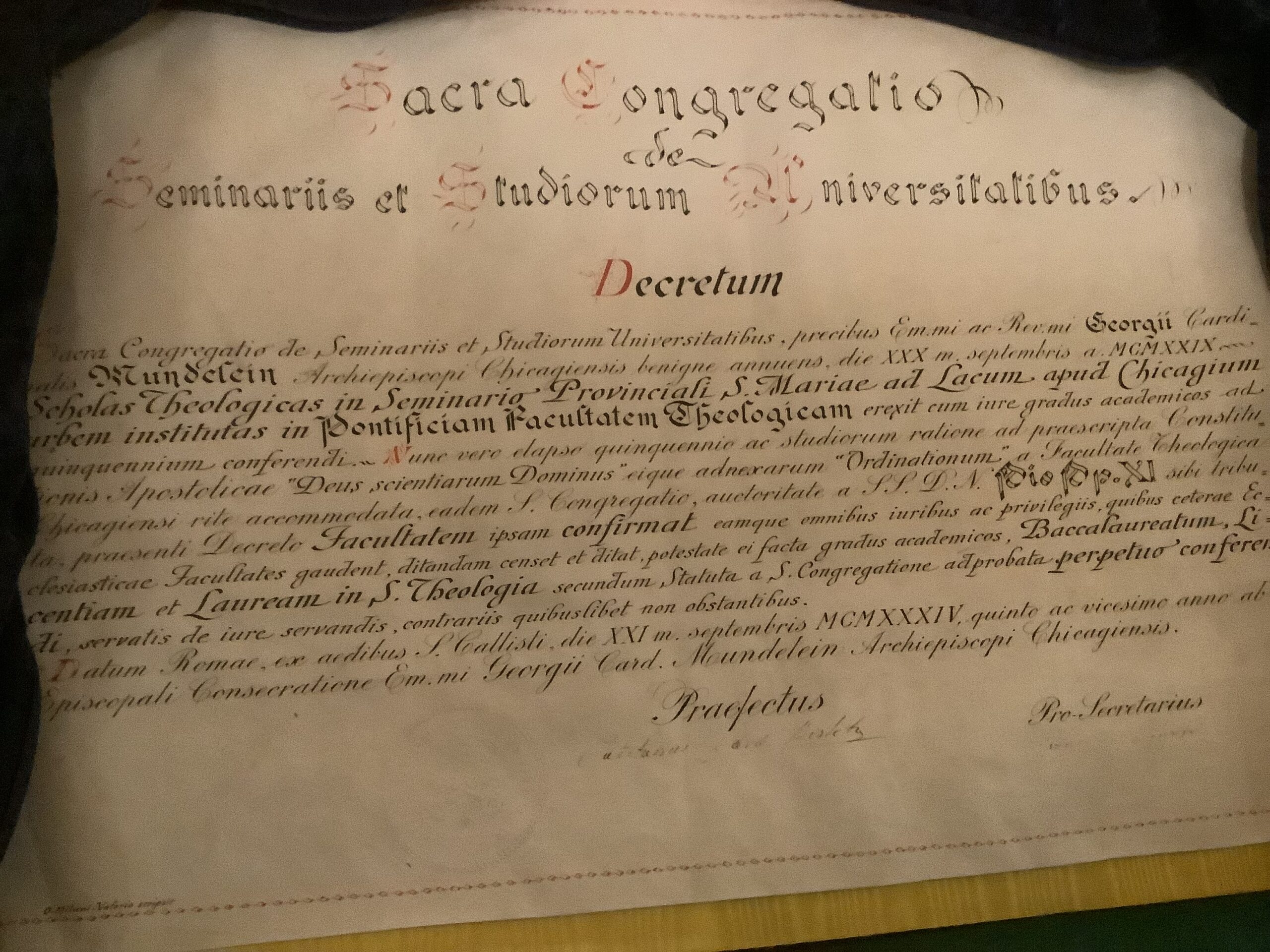 At the top of the stairs in Feehan library is an unassuming little display case. In this case is kept the original decree giving the University of Saint Mary of the Lake the privilege of granting degrees in Sacred Theology. USML was the first seminary in the United States to receive this decree under the Apostolic Constitution “Deus Scientiarum Dominus.”